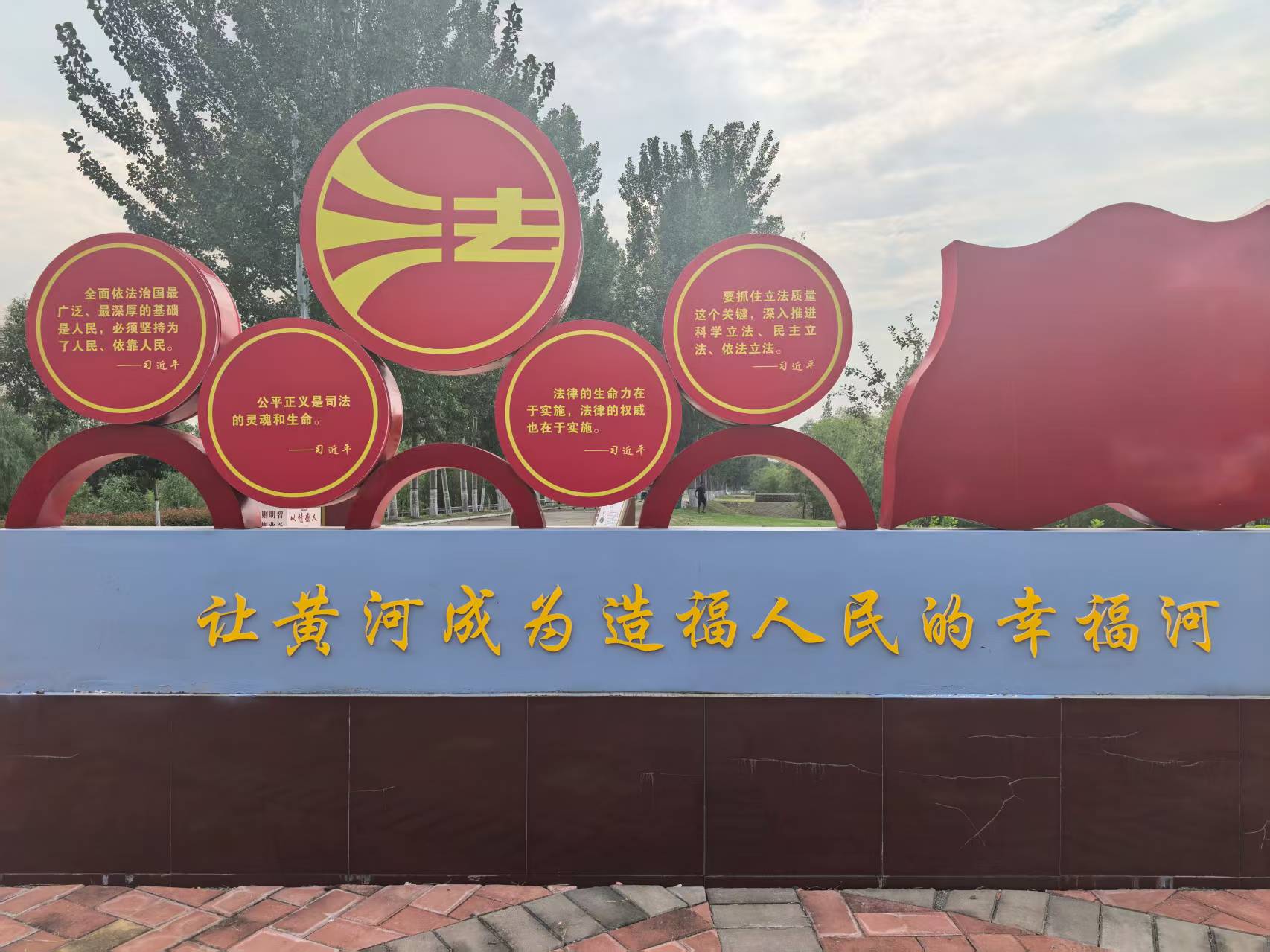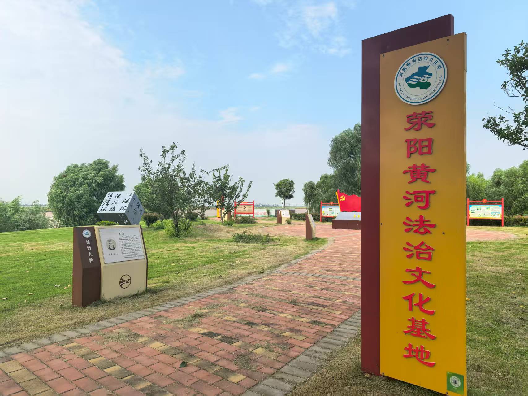 荥阳黄河法治文化基地坐落于荥阳河务局辖区金沟控导工程,2023年2月2日正式获评“全国法治宣传教育基地河南黄河法治文化带第二批示范基地”。该基地以荥阳黄河文化历史为依托,划分为法治文化宣传区、黄河文化展览区、生态景观区等功能文化区,形成集普法教育、休闲娱乐、游览观光多重元素为一体的法治文化基地。荥阳黄河法治文化基地始终坚持弘扬新时代中国特色社会主义法治思想,致力于打造成为荥阳黄河法治文化宣传新地标、新名片。