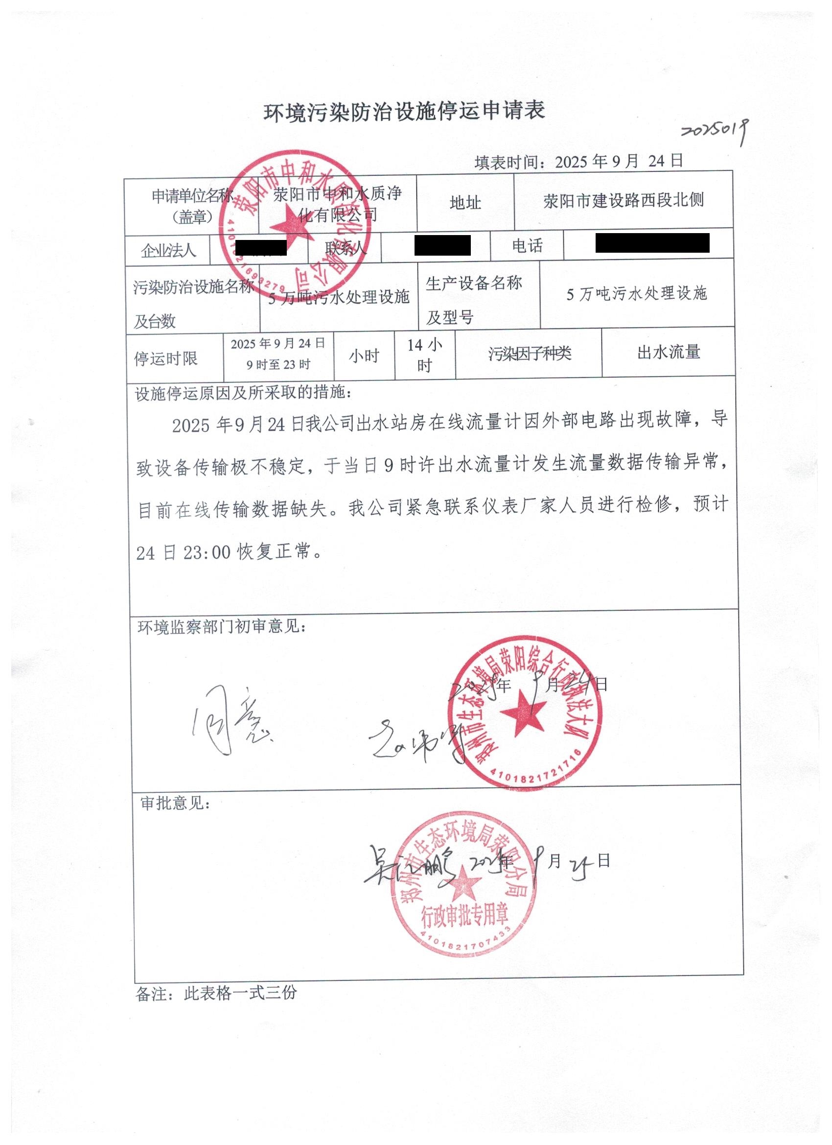 荥阳市中和水质净化有限公司环境污染防治设施停运申请