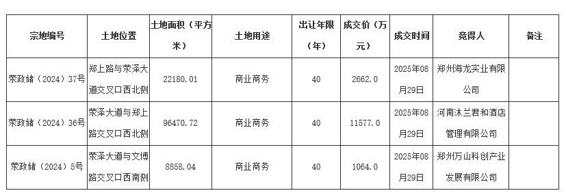荥阳市自然资源和规划局国有土地使用权招拍挂出让成交公示(202506)